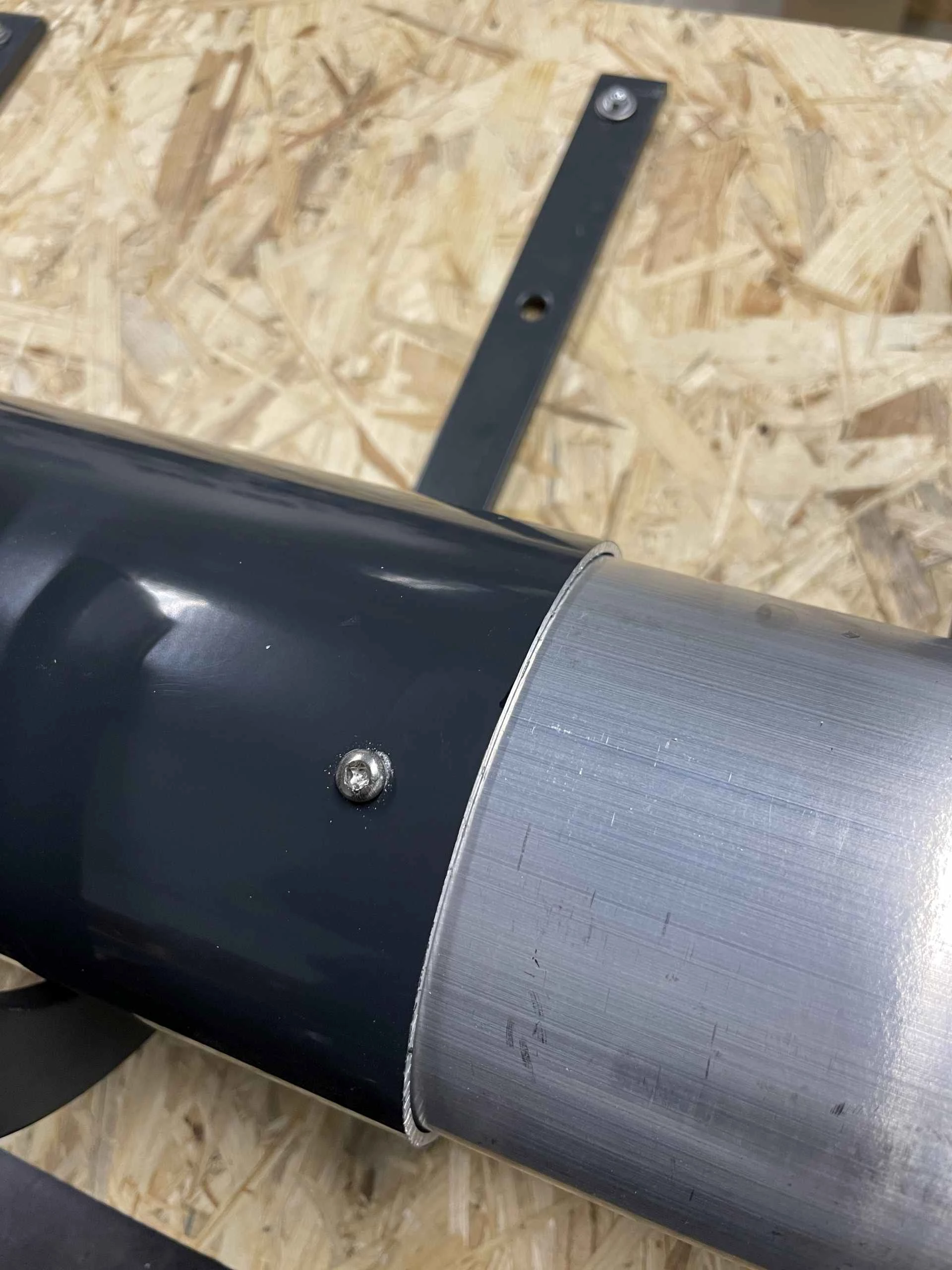 Muffe ( Alu-Rohr 115 x 5 mm) bis zur Hälfte in das Rundrohr (120 x 2mm) schieben und mit der mitgelieferten, selbstschneidenden Schraube befestigen. Nächstes Rundrohr gegenschieben und wieder verschrauben.