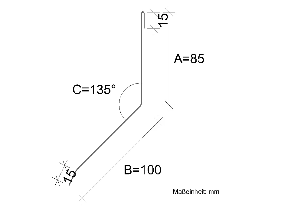 Der Biegewinkel C kann nach Ihrer Vorgabe geändert werden, bitte geben Sie hierzu Ihre Dachneigung an. (-> Maßanfertigung, keine Rückgabe möglich)