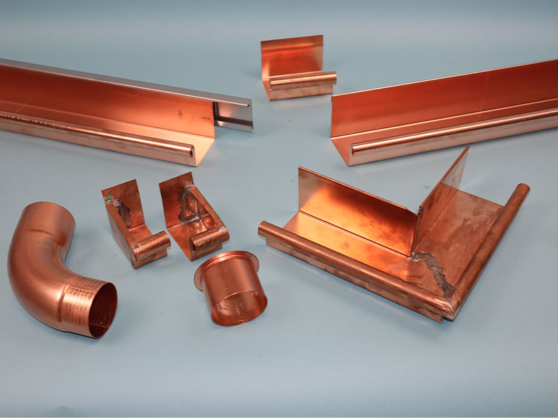 Kupfer ist ein extrem langlebiges und beständiges Metall und aufgrund dieser Eigenschaften auch sehr preisintensiv. Das Material bildet eine natürliche Schutzschicht, die Patina. Es hat gute Verarbeitungseigenschaften, d.h. es lässt sich Weichlöten, Hartlöten und Falzen. Es eignet sich deshalb besonders gut für Dachrinnen und Blechprofile. Die Lebensdauer liegt im Regelfall bei über 80 Jahren. Im Lieferzustand ist es rötlich hell glänzend, nach Kontakt mit Wasser bildet es erst Flecken, nach einiger Zeit entsteht daraus die mattbraune und später auch grünliche Patina.
