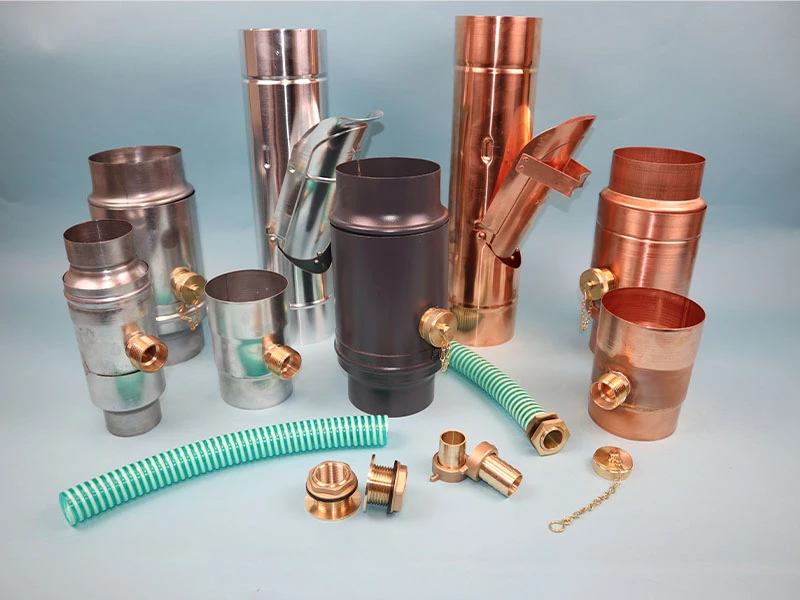 Es gibt Regenwassersammler aus verschiedenen Materialien. Sie können aus Kunststoff bestehen, aus Zink oder aus Kupfer. Es handelt sich dabei um die gleichen Materialien, aus denen handelsübliche Dachrinnen und Fallrohre gefertigt sind. Ein Materialmix aus Metallregenrohren und einem Regenwassersammler aus Kunststoff ist dabei nicht zu empfehlen. Die elektrische Leitfähigkeit zum Boden wäre unterbrochen und könnte zu Problemen bei Blitzeinschlag führen. Ebenso ist eine Mischung verschiedener Metalle zu vermeiden, da sie sich gegenseitig auf Dauer angreifen und beschädigen würden.