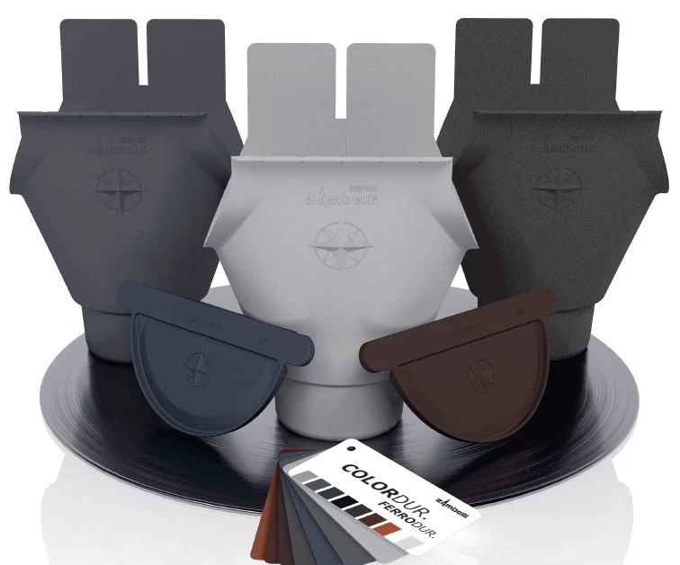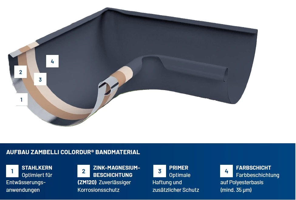 Zambelli COLORDUR® ist ein hochwertiges Dachentwässerungssystem aus farbbeschichtetem Stahl, das gestalterische Freiheit und zuverlässige Funktion kombiniert. Es umfasst alle relevanten Komponenten einer funktionierenden Dachentwässerung. Zambelli COLORDUR® Coils und Tafelbleche runden das Sortiment stimmig ab. Zambelli COLORDUR® ist Funktion in ihrer schönsten Form. Ein formstabiler Stahlkern wird mit einer Zink- Magnesium-Beschichtung vor Korrosion geschützt und mit langlebigem Farbauftrag ummantelt. Dieser durchdachte Materialaufbau macht das System nicht nur widerstandsfähig, sondern zum qualitativ hochwertigen Stilelement.