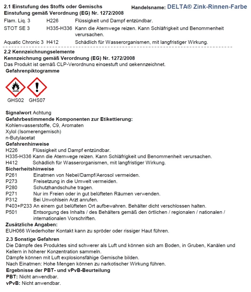 Dickschichtiger, lösemittelhaltiger, hochviskos eingestellter 1‑Komponenten Beschichtungsstoff als Korrosionsschutz mit direkter Haftung für den Außenbereich. Zur Beschichtung von Dachrinnen aus Zink, Kupfer, verzinktem Stahl und Aluminium in Land‑, Stadt‑, Industrie‑ und Meeresatmosphäre.