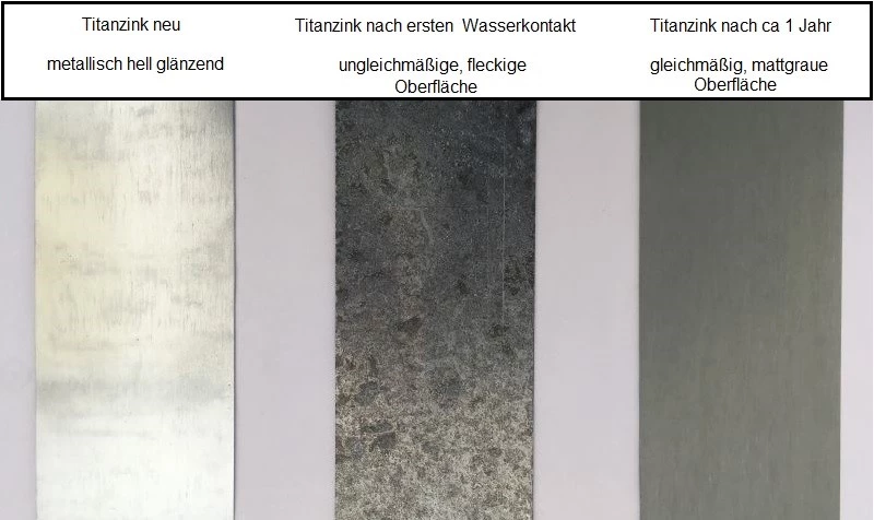 Wichtiger Hinweis: Auf dem Titanzink bilden sich nach den ersten Bewitterungen bzw. Kontakt mit Wasser starke Flecken. Diese Erscheinung ist normal und gehört zum chemischen Prozess der Oxidschichtbildung (Patina). Die Verfärbungen ändern sich fortwährend nach weiteren Witterungseinflüssen bis eine annähernd gleichmäßig mattgraue Oberfläche entsteht. Um diesen Vorgang zu umgehen wird vorbewittertes Material (auf Anfrage) angeboten, es ist etwas teurer bietet aber von Anfang an eine optisch ansprechende Oberfläche