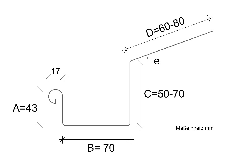 Die Dachneigung wird von der Waagerechten aus gemessen, d.h. wenn Sie 88-90° auswählen, wird der Schenkel D nicht abgekantet, sondern bildet eine Verlängerung vom Schenkel C (siehe Skizze).