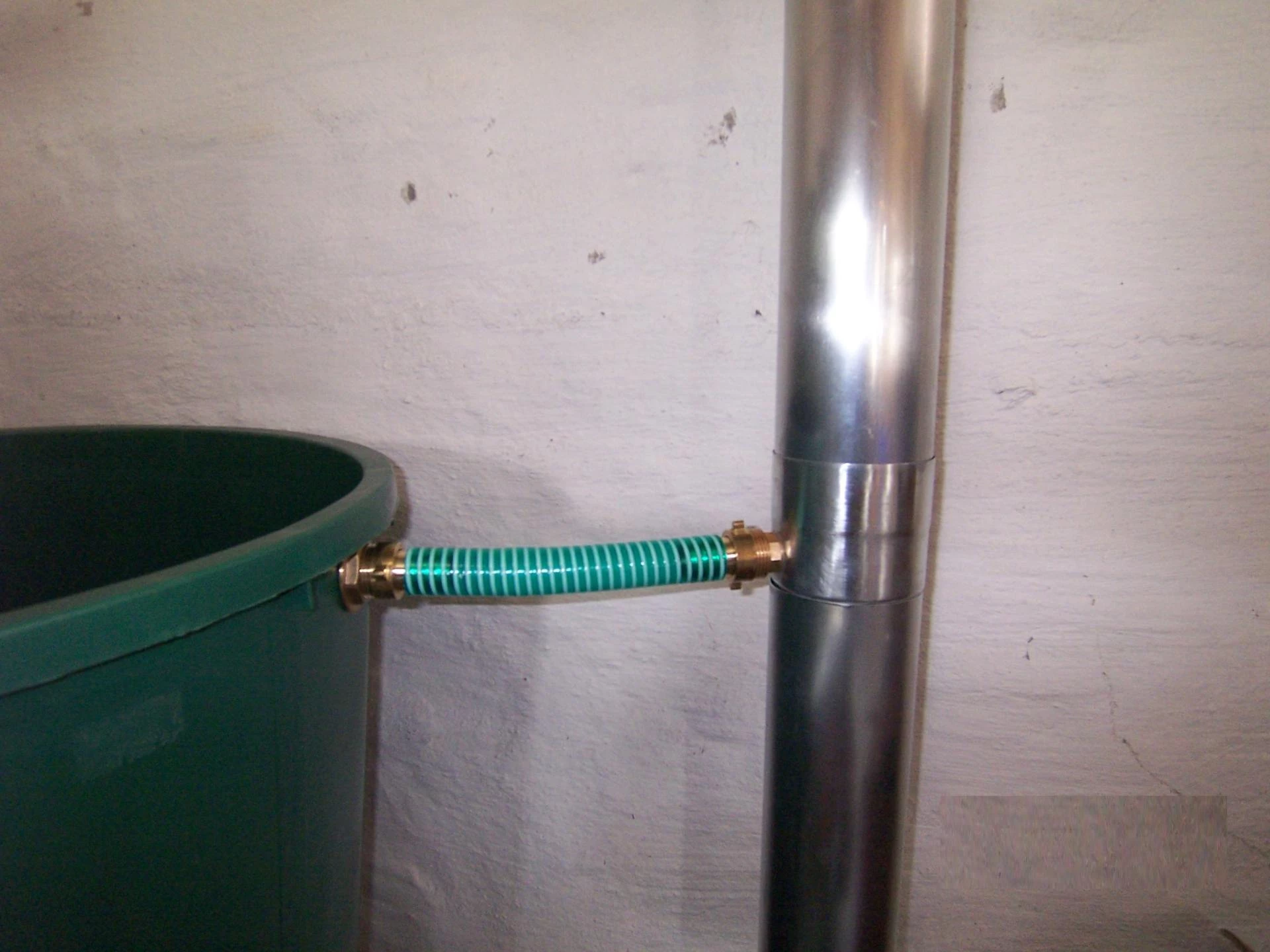 Die Ableitung des Regenwassers erfolgt über eine Rinne im Inneren des Sammlers. Der Sammler hat eine Überlaufstoppfunktion. Anschlussgröße: 1 Zoll Außengewinde