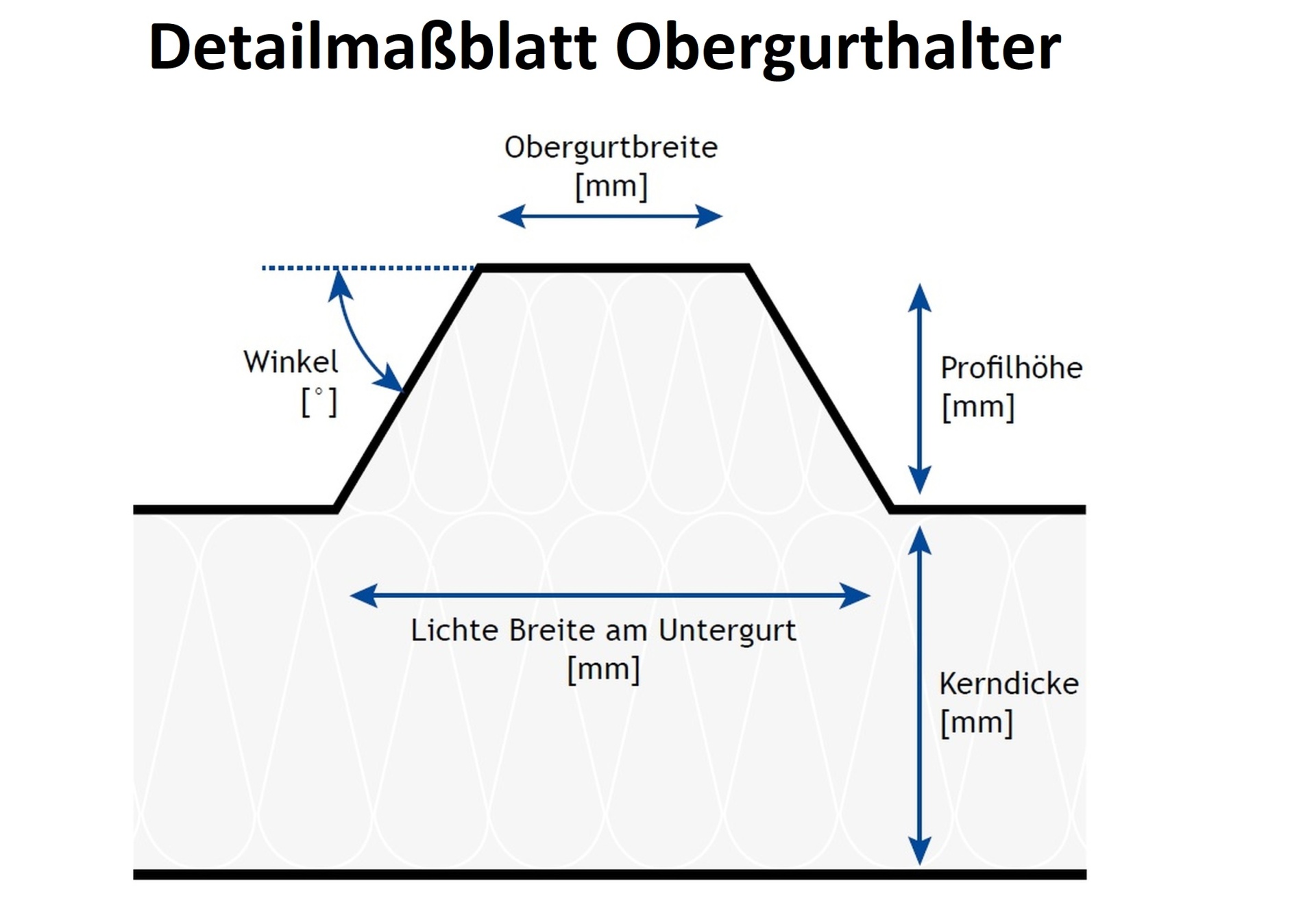 Die Form und Abmessungen des Obergurthalters richten sich nach der Profilform (Winkel und Breite des Obergurtes) des Sandwichelementes, Sie können es entweder über den Herstellername oder durch Abmessen der Form (Detailmaßblatt) auswählen.