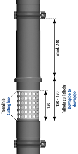 - am unteren Ende wird eine Fallrohrsteckmuffe (Fallrohrverbinder) benötigt, wenn die Schiebemuffe in ein stumpfes (abgesägtes) Fallrohr-Ende eingesteckt werden soll