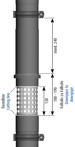 - am unteren Ende wird eine Fallrohrsteckmuffe (Fallrohrverbinder) benötigt, wenn die Schiebemuffe in ein stumpfes (abgesägtes) Fallrohr-Ende eingesteckt werden soll