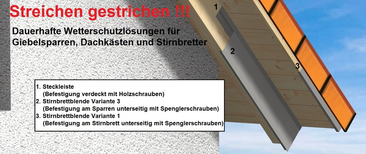 Bei der hier angebotenen Steckleiste handelt es sich um optionales Zubehör für unsere Dachblenden, damit kann die Stirnbrettblende indirekt befestigt werden und muss nur von unten angeschraubt werden. Auch ist damit die Ausdehnung des Bleches bei Wärme/Kälte besser möglich.