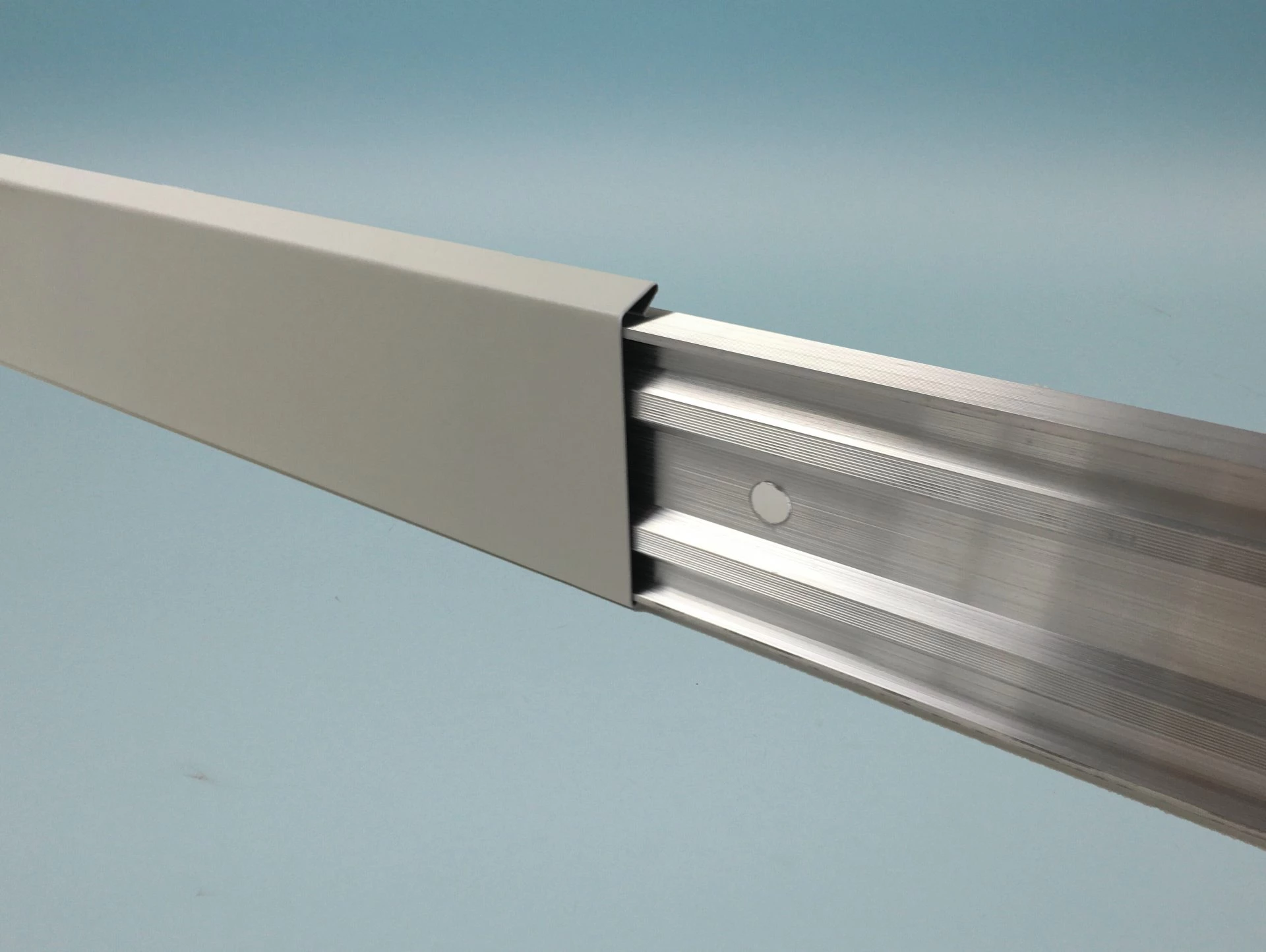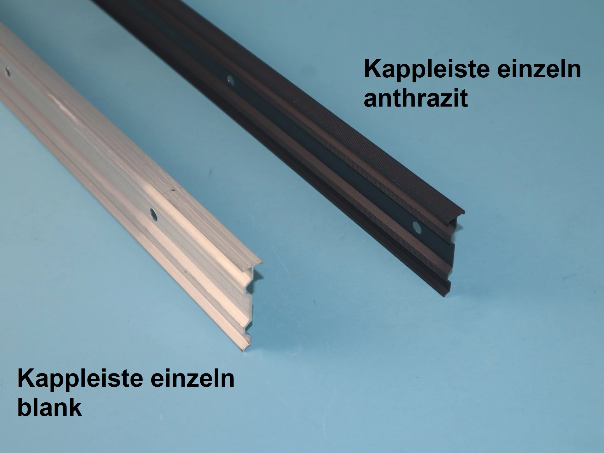 Bei der Auswahl der passenden Blende wird die Kappleiste blank gemeinsam mit der optischen Blende geliefert. Diese wird von unten in die Kappleiste eingehangen und mit der oberen Kante auf der Kappleiste eingeklickt, hier ein Kurzvideo als Hilfestellung. Außerdem erhalten Sie einen passenden Verbinder pro Stück (siehe Bild) dazu.